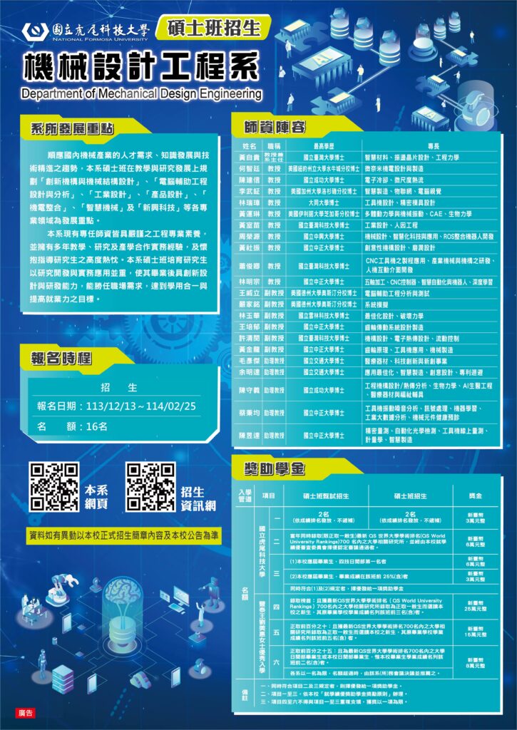114學年度機械設計工程系碩士班招生-報名日期113/12/13~114/02/25,歡迎有興趣的同學報名~ 2024-12-12 AdminAdmin 114學年度機械設計工程系碩士班招生 報名日期:113/12/13~114/02/25 招生名額:16名 ~歡迎有興趣的同學報名~